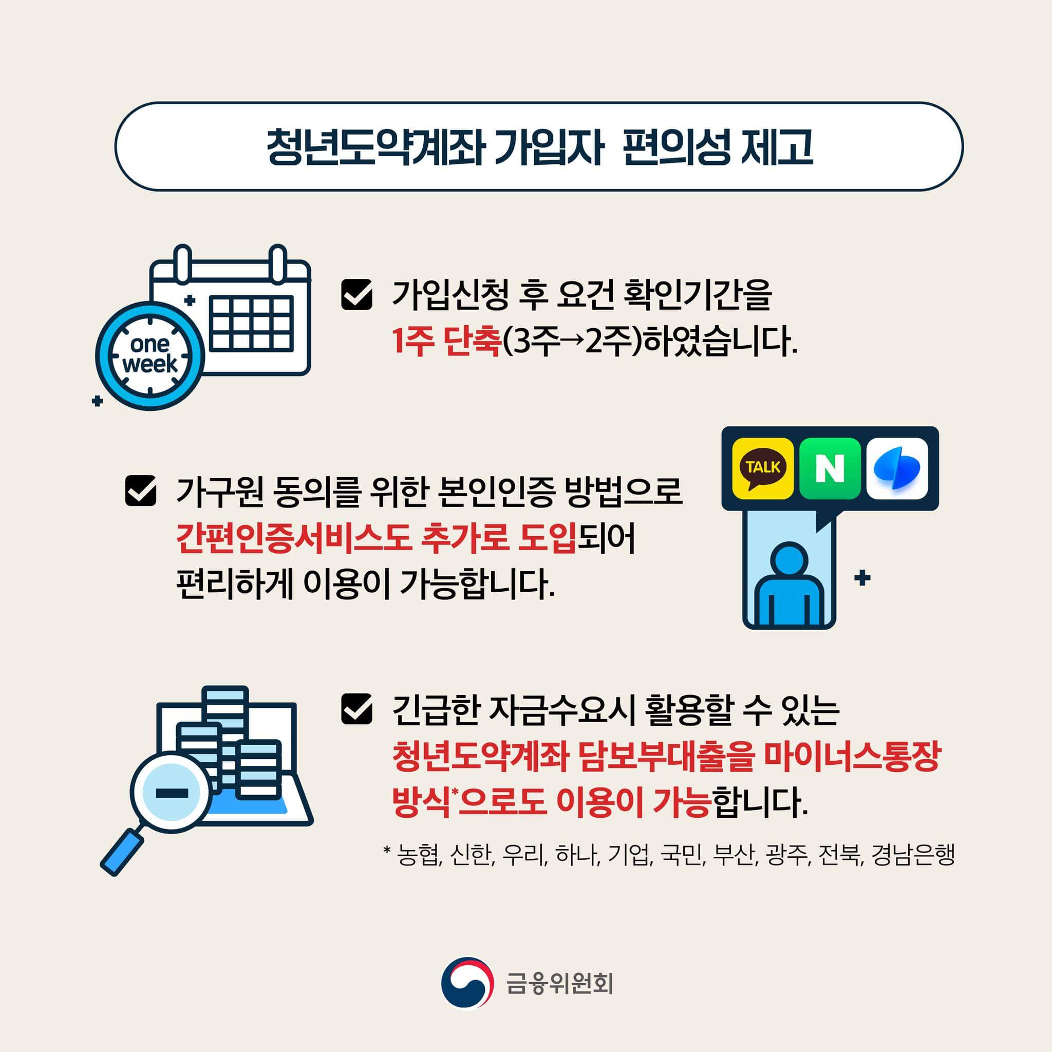 청년도약계좌 담보부 대 출 을 마이너스 통장 방식으로도 이용하실 수 있습니다.(농협,신협,우리,하나,기업,국민,부산,광주,전북,경남은행)