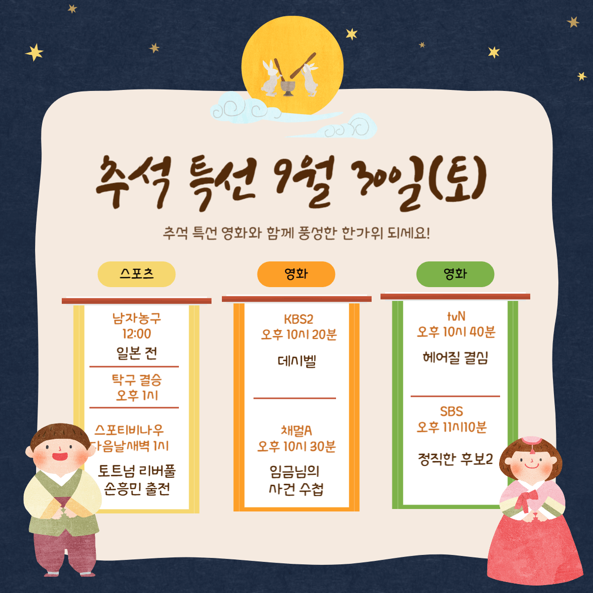 2023 추석 연휴의 3일차입니다. 어제 손님들은 잘 다녀가셨나요? 9월 30일 영화와 예능 tv 편성표입니다. 오늘은 특히 손흥민 선수 경기가 있습니다. 영화 헤어질 결심 등과 아시안게임 남자 농구 일본 전, 탁구 결승 등 편성표 입니다.
