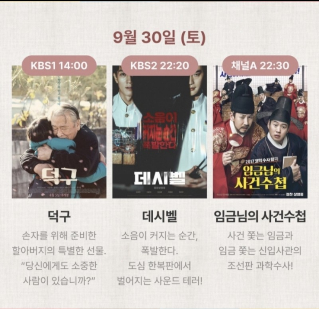 2023 추석 연휴의 3일차입니다. 어제 손님들은 잘 다녀가셨나요? 9월 30일 영화와 예능 tv 편성표입니다. 오늘은 특히 손흥민 선수 경기가 있습니다. 영화 헤어질 결심 등과 아시안게임 남자 농구 일본 전, 탁구 결승 등 편성표 입니다.