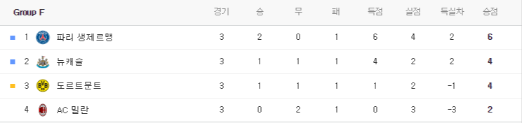 F조 1위였던 누캐슬이 오늘 같은 시간 열린 도르트문트에 패배하면서 PSG가 죽음의 조에서 1위로 올라섰습니다.