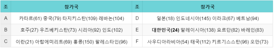 E | 대한민국(24) 말레이시아(138) 요르단(82) 바레인(83) |