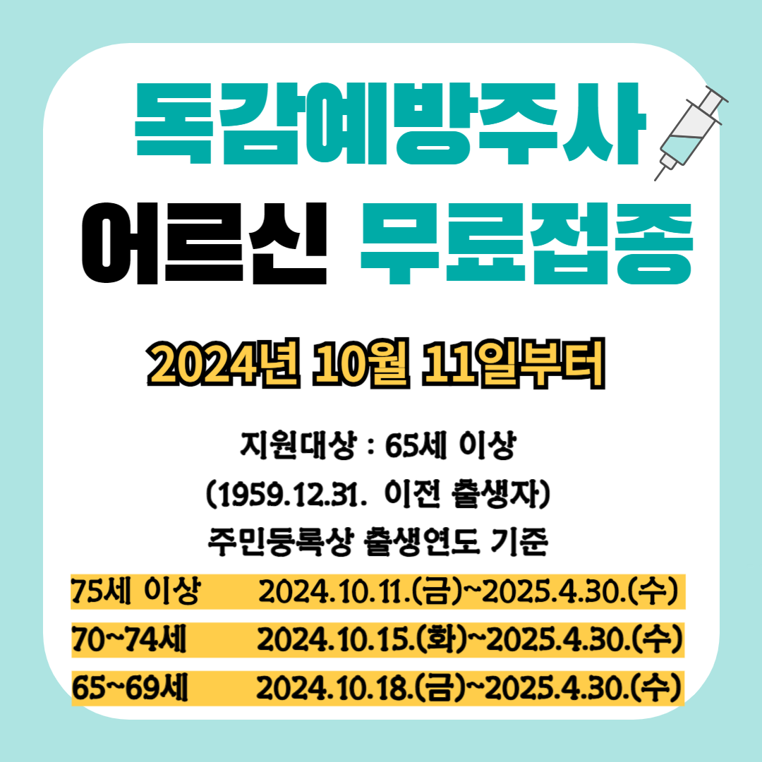 2024년 10월 11일부터 만 65세 이상 어르신들을 위한 인플루엔자 무료접종 일정이 발표되었습니다. 올해부터 해당되시는 분은 아래 글을 참조하시어, 12월이 오기 전에 접종받으세요!