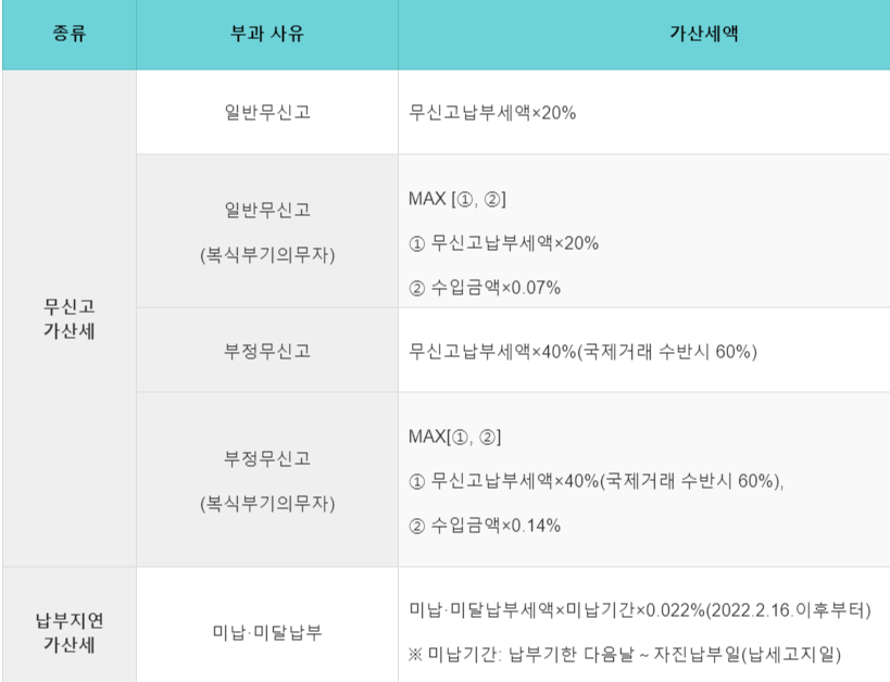 | 종류 | 부과 사유 | 가산세액 |