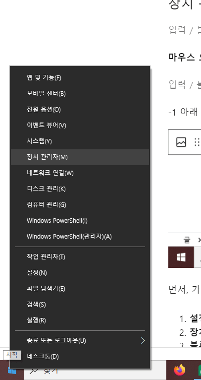 - 윈도우 시작 버튼 우클릭: 화면 좌측 하단의 윈도우 아이콘을 마우스 오른쪽 버튼으로 클릭하세요.