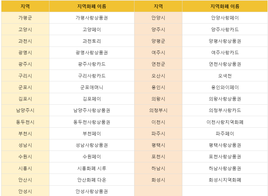 | 지역 | 지역화폐 이름 | 지역 | 지역화폐 이름 |