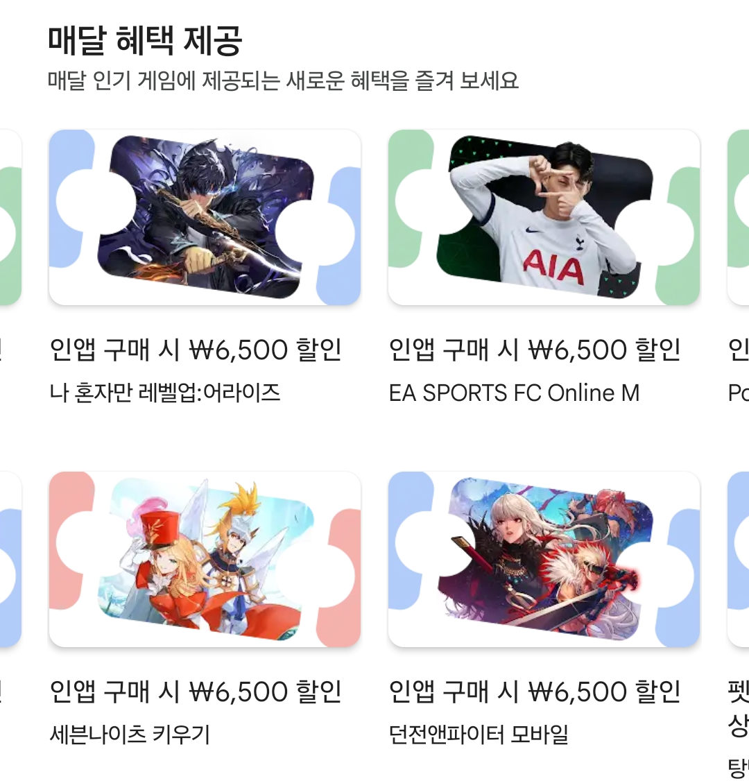 무료 체험 기간이거나 Play Pass 카탈로그에 있는 게임의 경우에는 혜택을 사용할 수 없습니다. 혜택은 Google Play 결제 수단을 통해서만 사용되어야 합니다.
