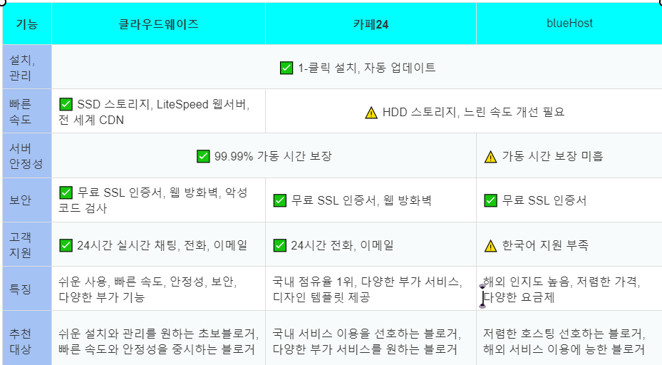 | 빠른 속도 | ✅ SSD 스토리지, LiteSpeed 웹서버, 전 세계 CDN | ⚠️ HDD 스토리지, 느린 속도 개선 필요 | |