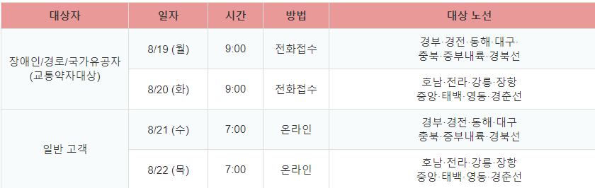 8/19 (월) | 9:00 | 전화접수 | 경부·경전·동해·대구· 충북·중부내륙·경북선 |
