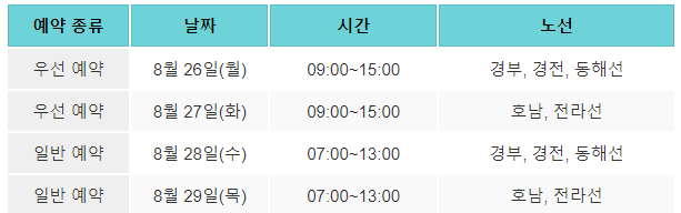 | 우선 예약 | 8월 26일(월) | 09:00~15:00 | 경부, 경전, 동해선 |