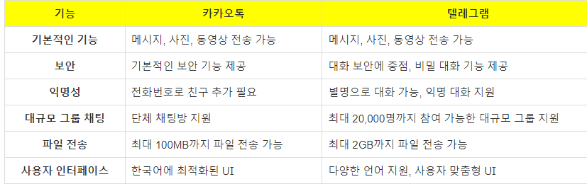 - 익명성: 텔레그램은 전화번호를 알려주지 않아도 대화를 할 수 있어 익명성이 보장됩니다. 카카오톡은 전화번호가 있어야 친구 추가가 가능하지만, 텔레그램에서는 별명만으로도 대화를 시작할 수 있습니다.