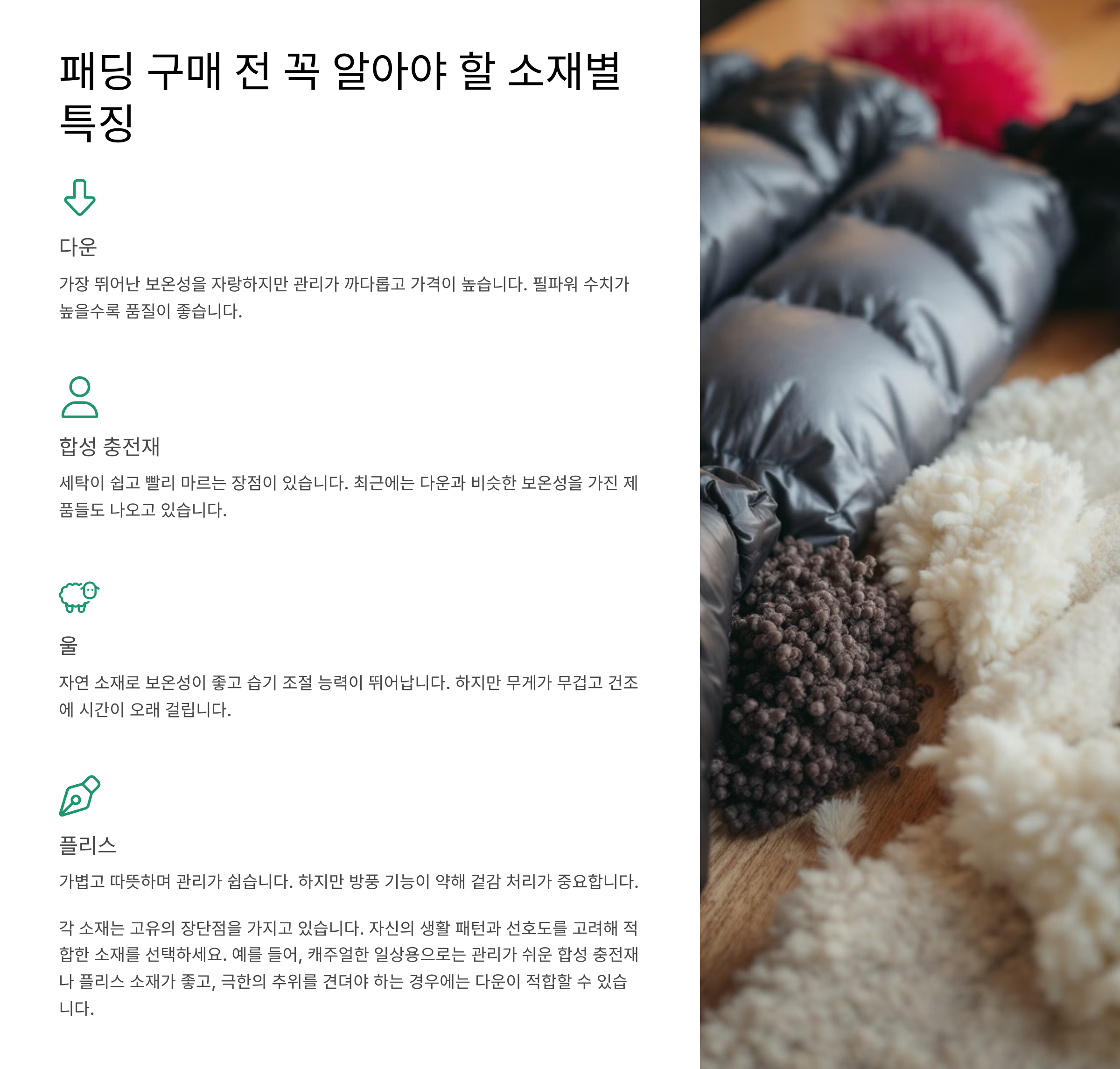 가볍고 따뜻하며 관리가 쉽습니다. 하지만 방풍 기능이 약해 겉감 처리가 중요합니다.