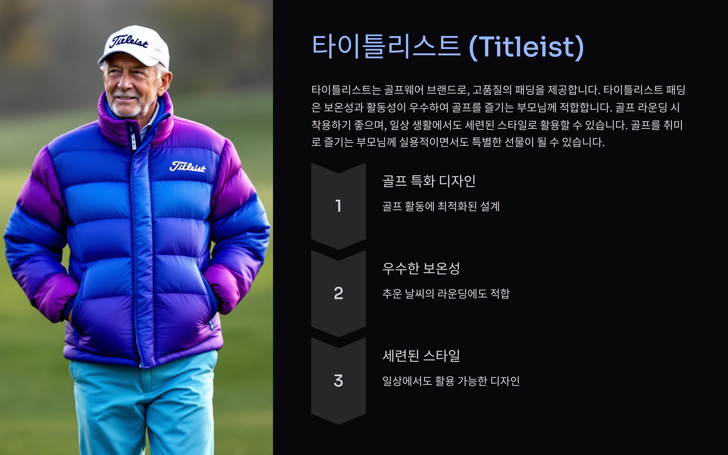 - 특징: 보온성과 활동성이 우수하여 야외 활동이 잦은 골퍼들에게 적합한 제품입니다. 특히 추운 날씨 속에서도 편안하게 착용할 수 있도록 제작되어 부모님 선물로도 추천드립니다.
