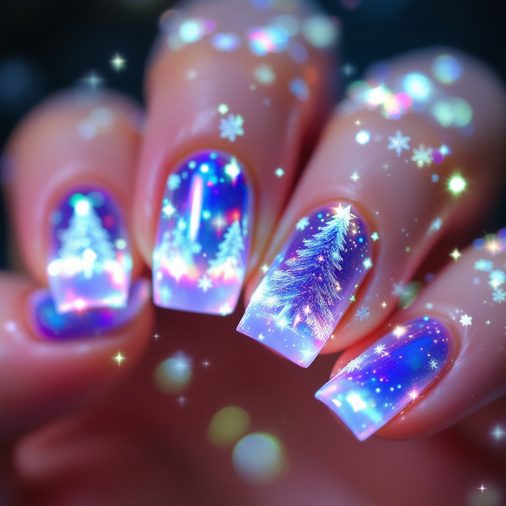 연말 파티 네일, 6탄! 반짝반짝 빛나는 크리스마스 밤 분위기를 모티브로 한 네일아트예요. 컬러풀한 라이트 디자인으로 파티 분위기를 한껏 살려보세요.
