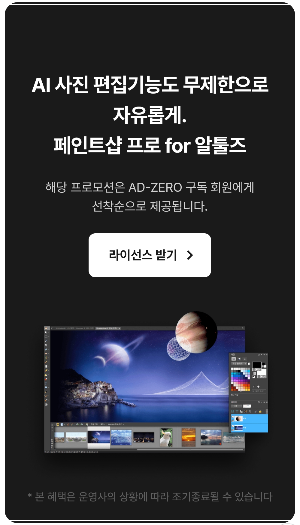 알툴즈 애드제로(AD-ZERO)는 기존 2,500만 유저가 이용하는 알툴즈에서 각종 광고를 제거한 버전으로, 오직 프로그램 기능에만 집중하고 싶다는 소비자의 니즈를 반영해 론칭한 구독형 서비스입니다.
